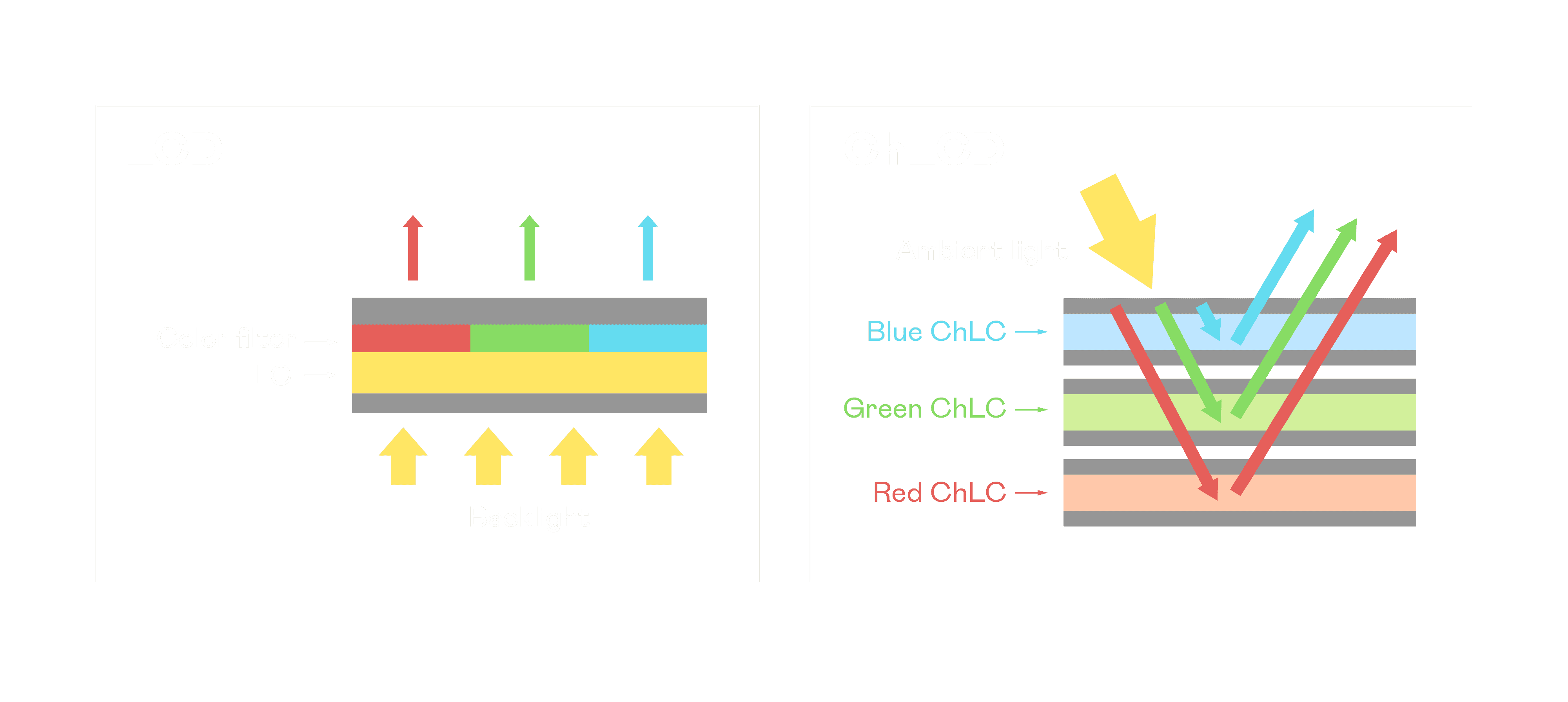 ChLCD 胆固醇液晶就如同纸张一样,,透过反射环境光来显示影像,,因此长时间观看不易造成人眼视觉疲劳,,,,可达到护眼效果。。当处于户外阳光下使用,,LCD 影像容易失真而不易观看,,但胆固醇液晶仍可维持较佳的影像品质。。
