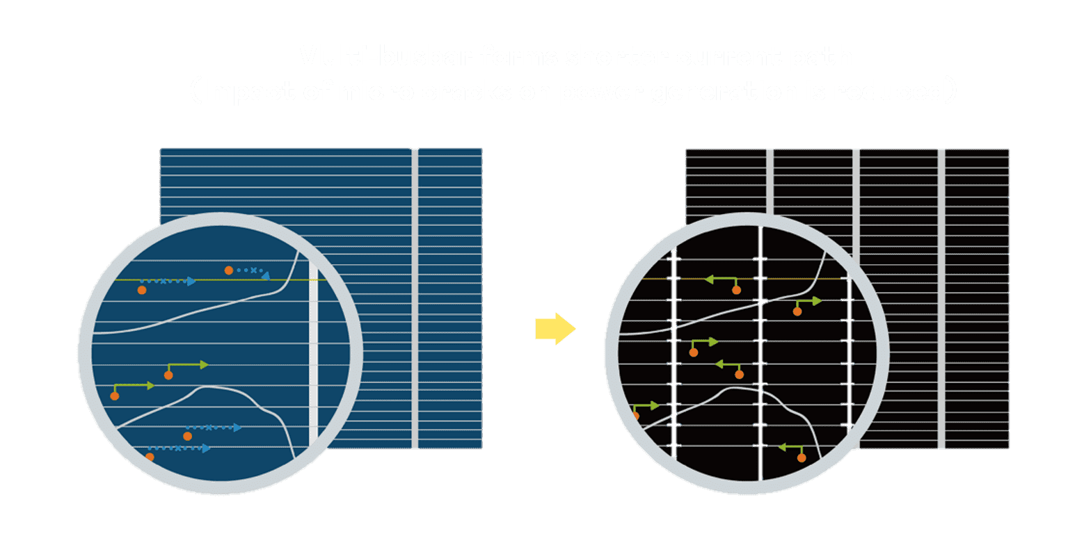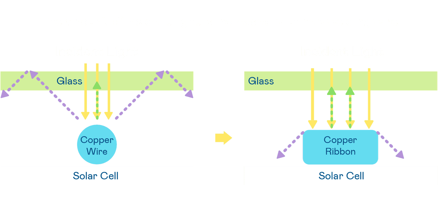 - 电池使用多条铜导线 (Copper wire) 于电池片上形成较短的电流路径,,提高电流收集效率,,采用圆形设计的铜导线较传统扁平式的铜焊带 (Ribbon),,可增加入射至电池的光线量。。。。