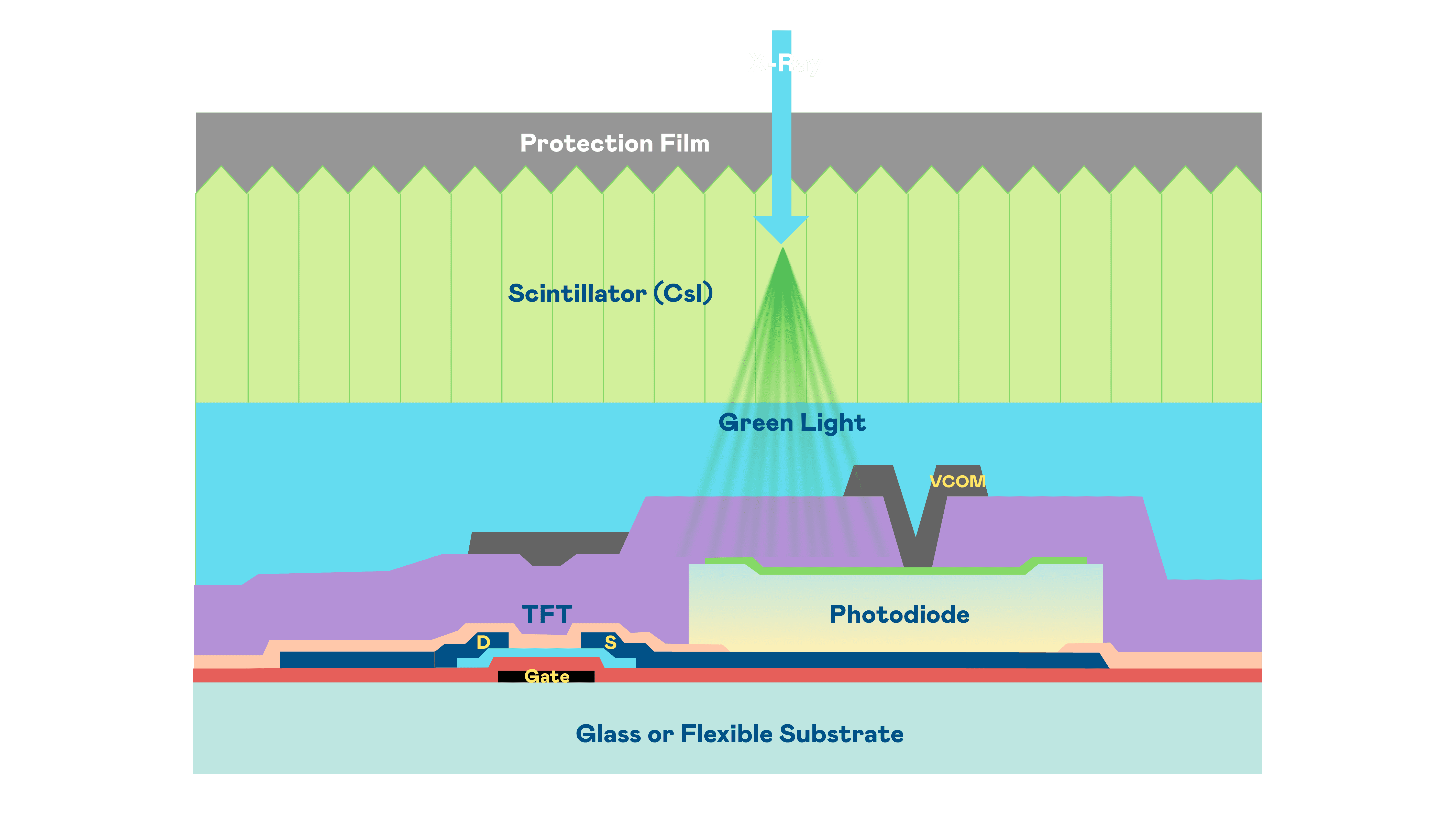 至成国际的X光影像感测阵列使用薄膜电晶体 (TFT) 作为每个像素的读取开关,,,搭配光电二极体(Photodiode)的光电转换元件,,用以感测X光影像讯号。。